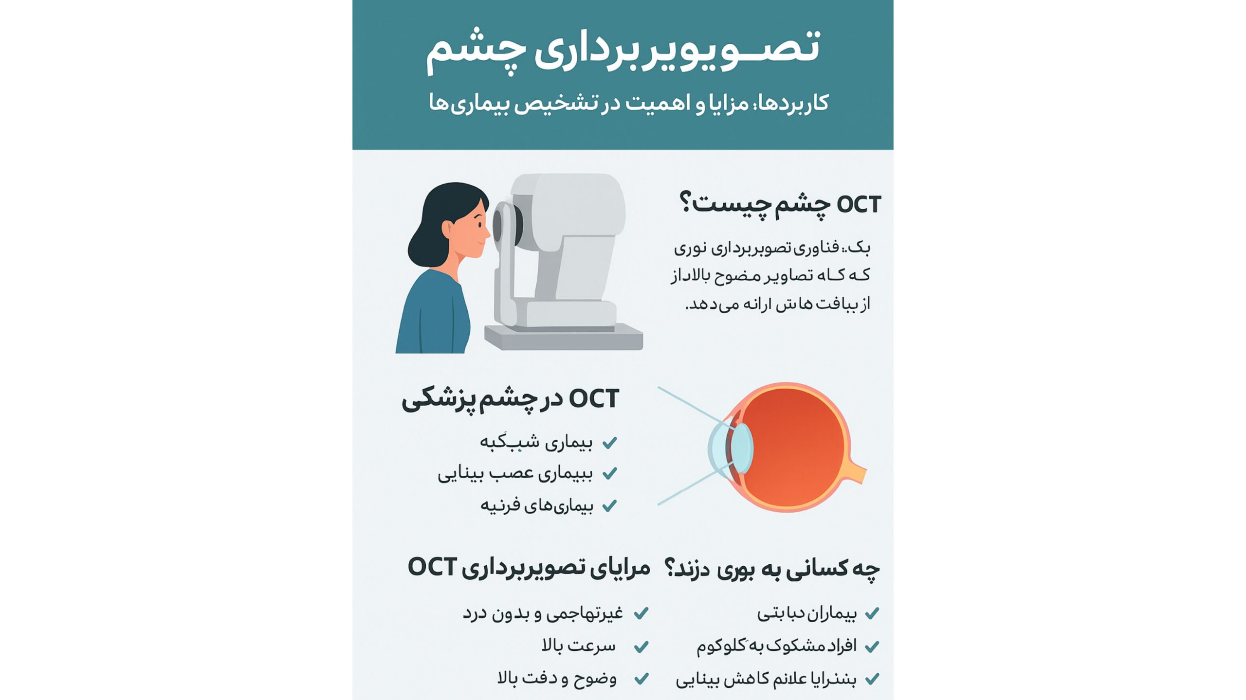 تصویربرداری OCT یک ابزار مهم برای تشخیص زودهنگام و پیگیری بیماری های چشم است. انجام منظم این تست، بهویژه در بیماران پرخطر، می تواند از بروز آسیب های جدی به بینایی جلوگیری کند.