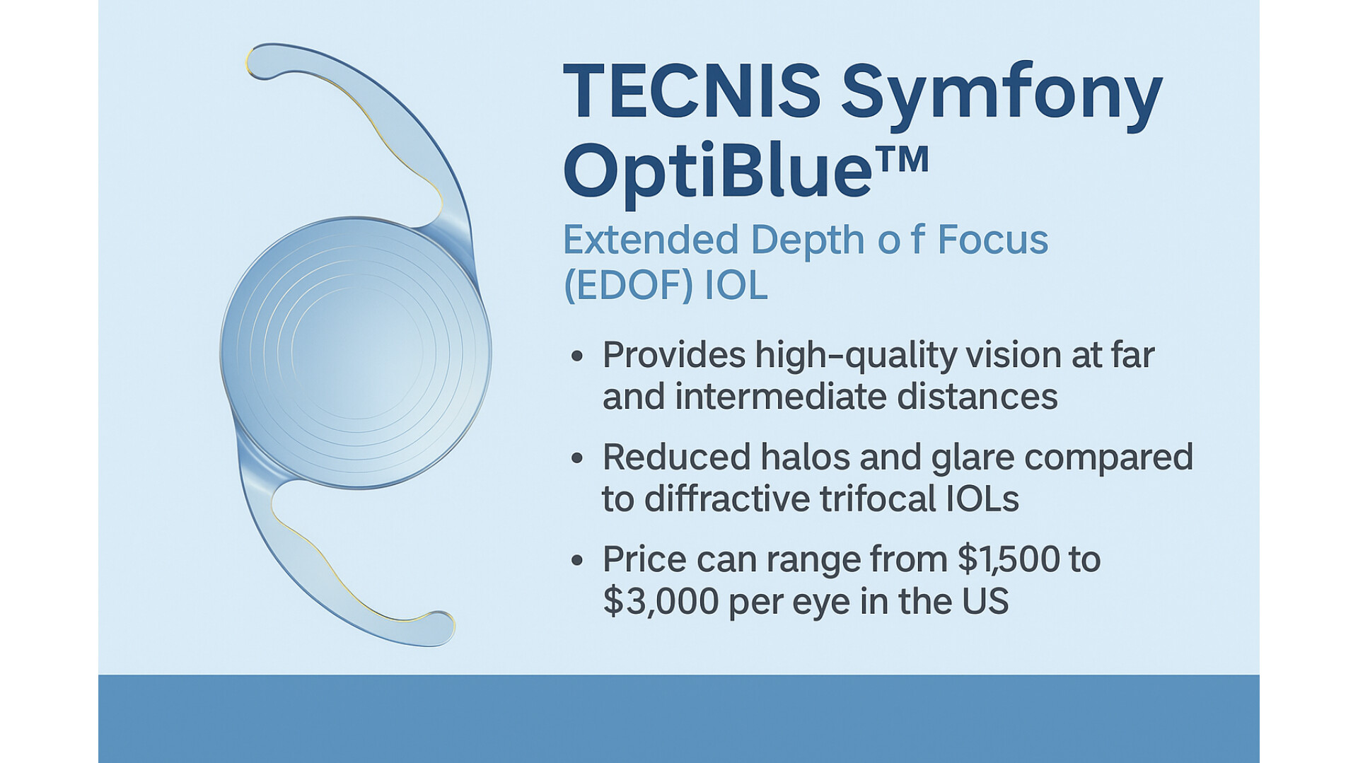 Tecnis Symfony OptiBlue ترکیبی از فناوری های پیشرفته است که دید با کیفیت در فواصل مختلف را بدون کاهش محسوس در دید شب و بدون نیاز به عینک ممکن می سازد. برای کسانی که دید میانه و دور آشکار می خواهند ولی حساس به هاله یا glare هستند، گزینه بسیار مناسبی محسوب می شود.