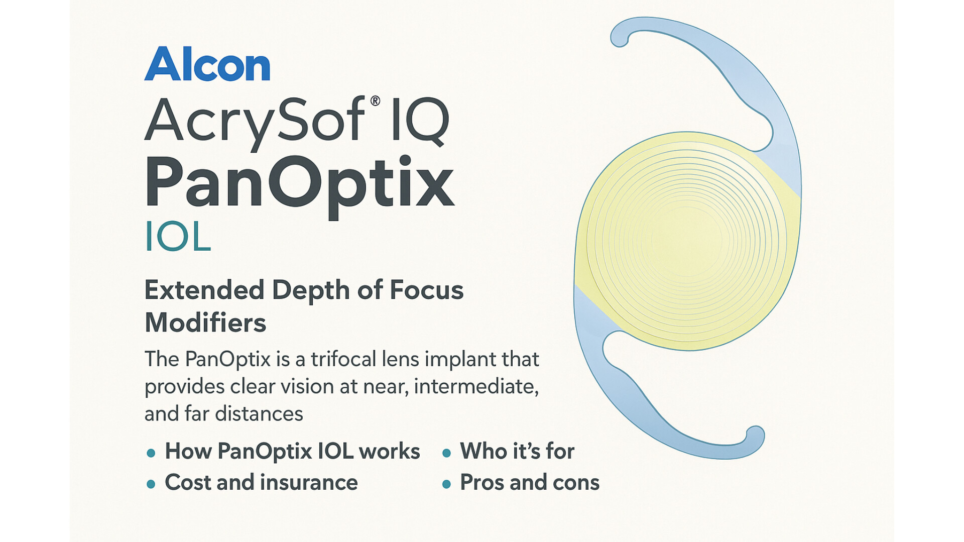 لنز Alcon PanOptix IOL انتخابی پیشرفته برای افرادی است که به دنبال کیفیت بینایی بالا در سه فاصله و کاهش وابستگی به عینک هستند. با وجود هزینه بالاتر، این لنز می تواند به طرز قابل توجهی کیفیت زندگی بیمار را پس از عمل جراحی آب مروارید بهبود ببخشد.